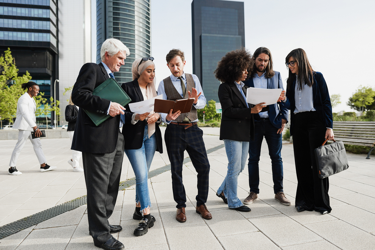 Multiethnic business people working outdoor from office building